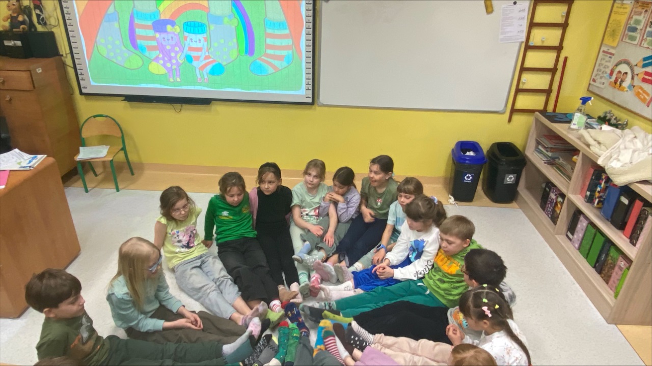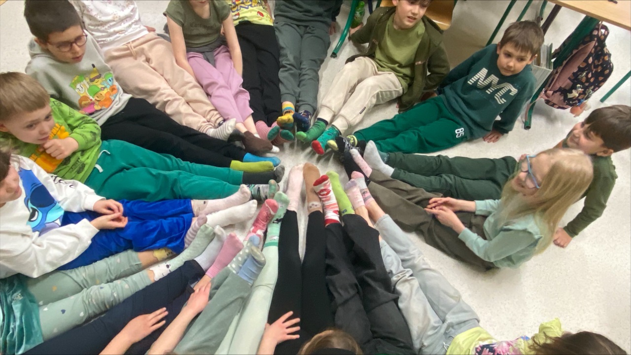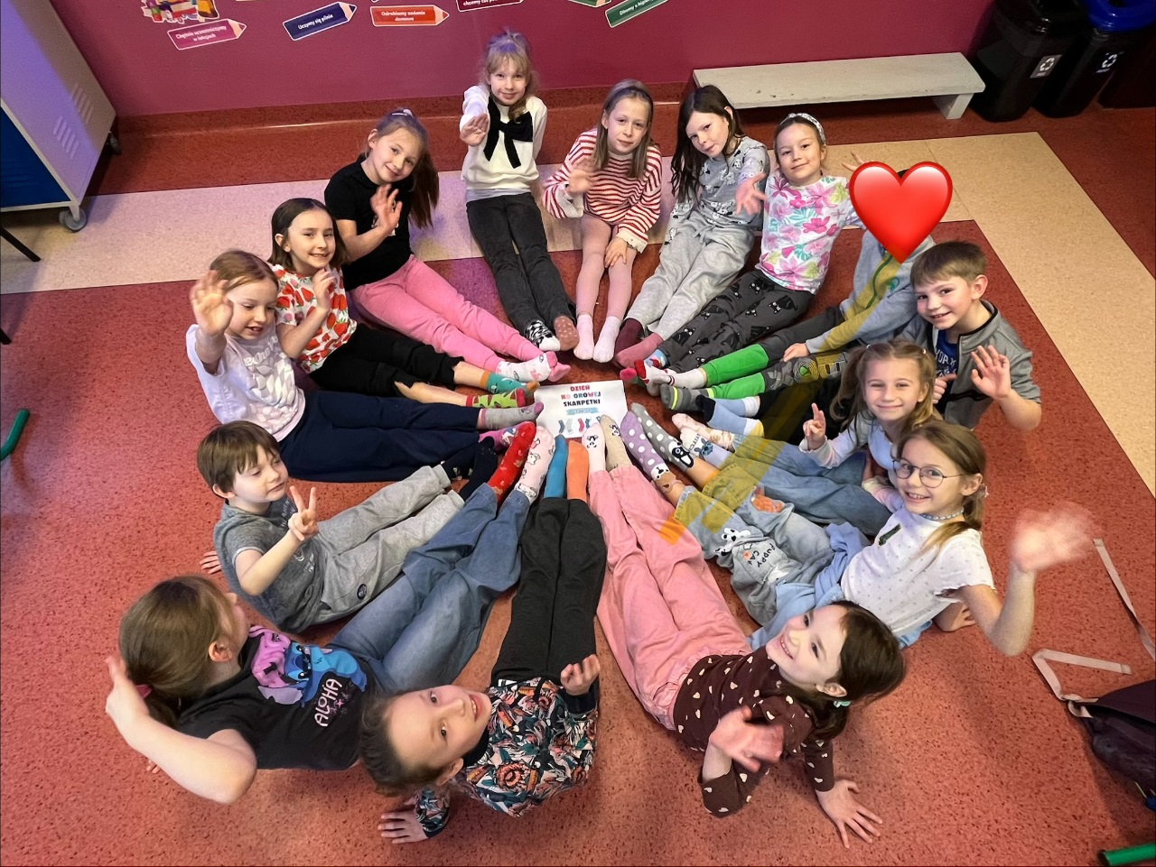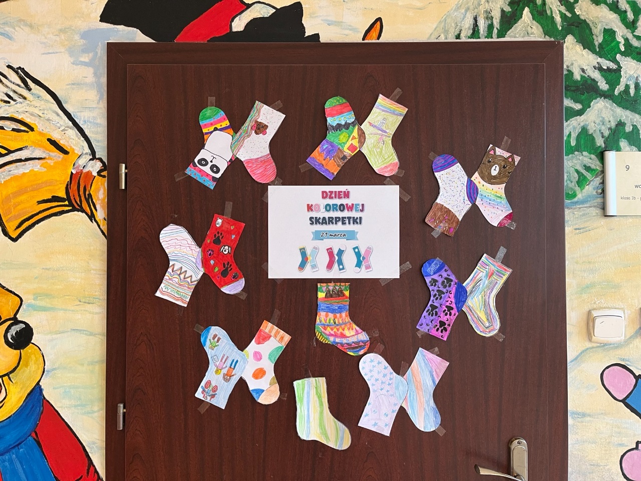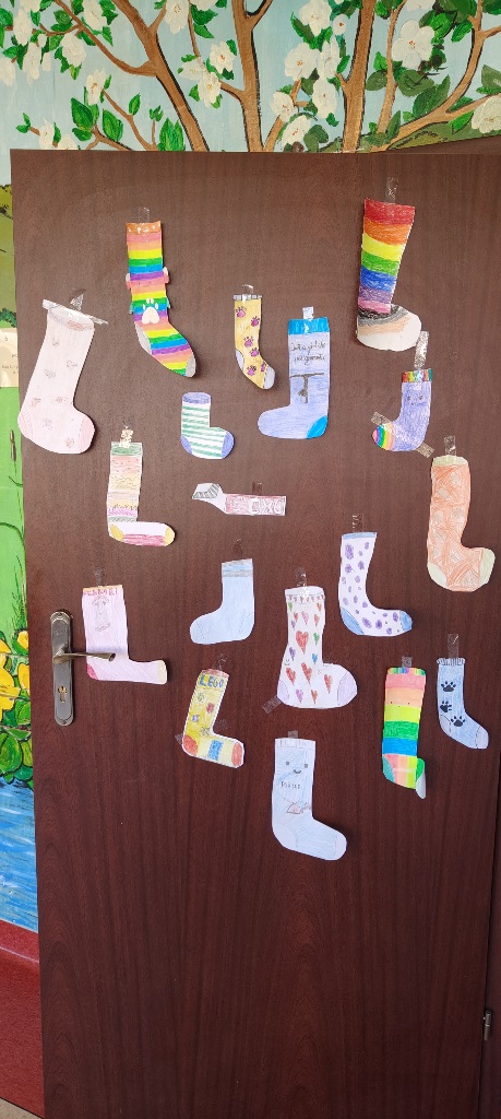 Dzieci z klas 1-3 obejrzały film, który wytłumaczył w dostępny i prosty sposób, że mimo różnic, wszyscy jesteśmy ważni i mamy równe prawa. Przy wesołych piosenkach nawiązujących do poruszanego tematu, dzieci stworzyły piękne, wesołe skarpety, które ozdobiła klasowe drzwi. Nie zapomnieliśmy oczywiście o kolorowych, nie do pary skarpetkach na naszych stopach 🧦