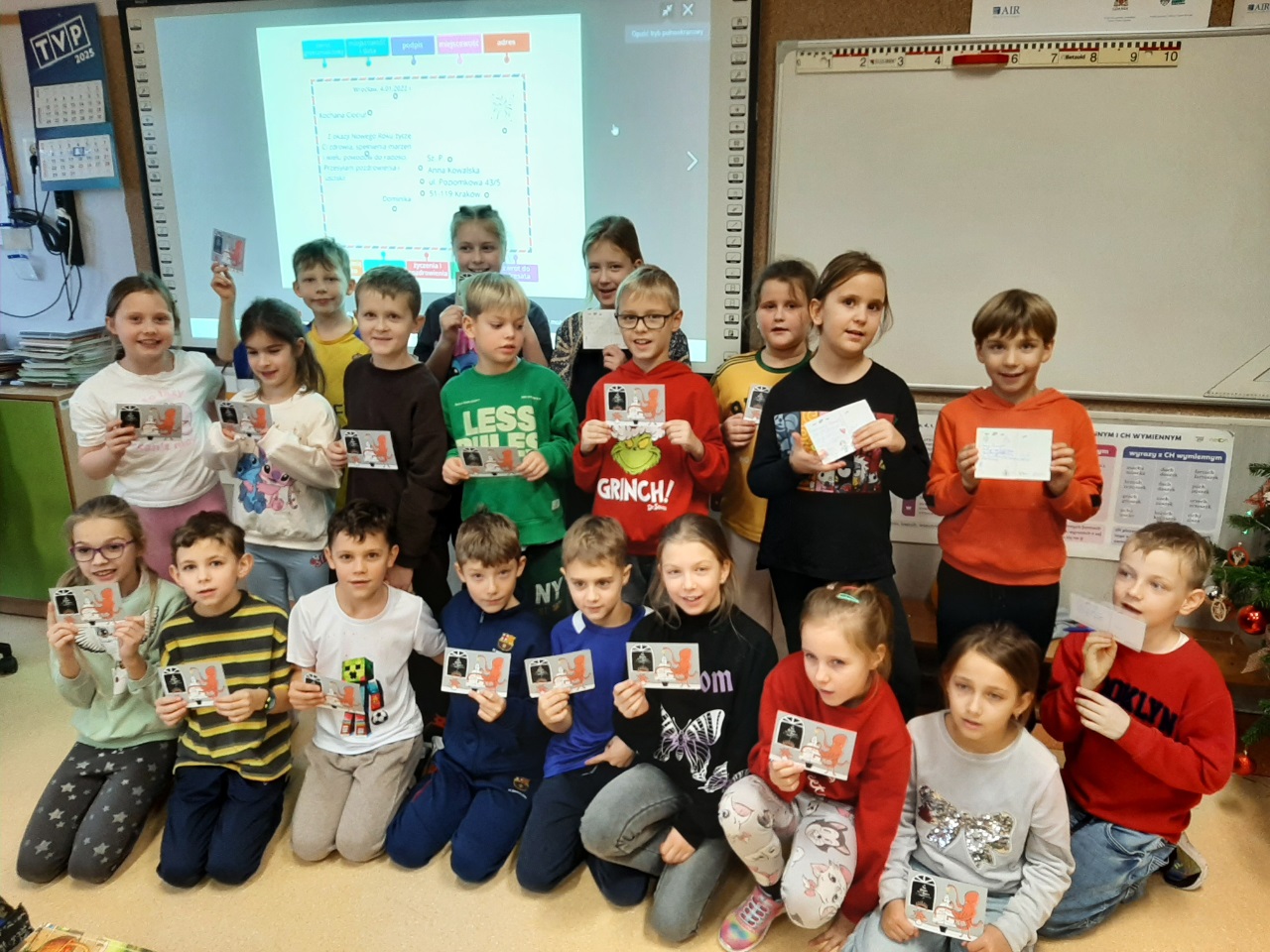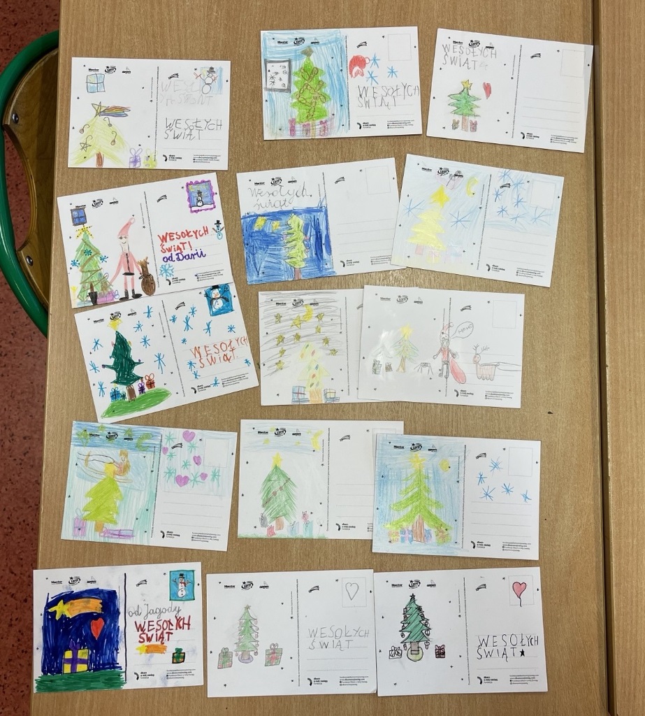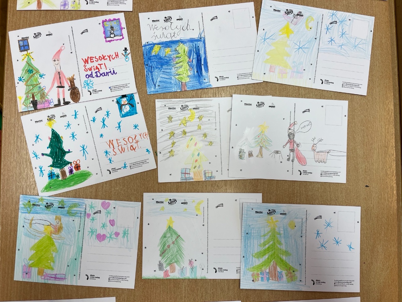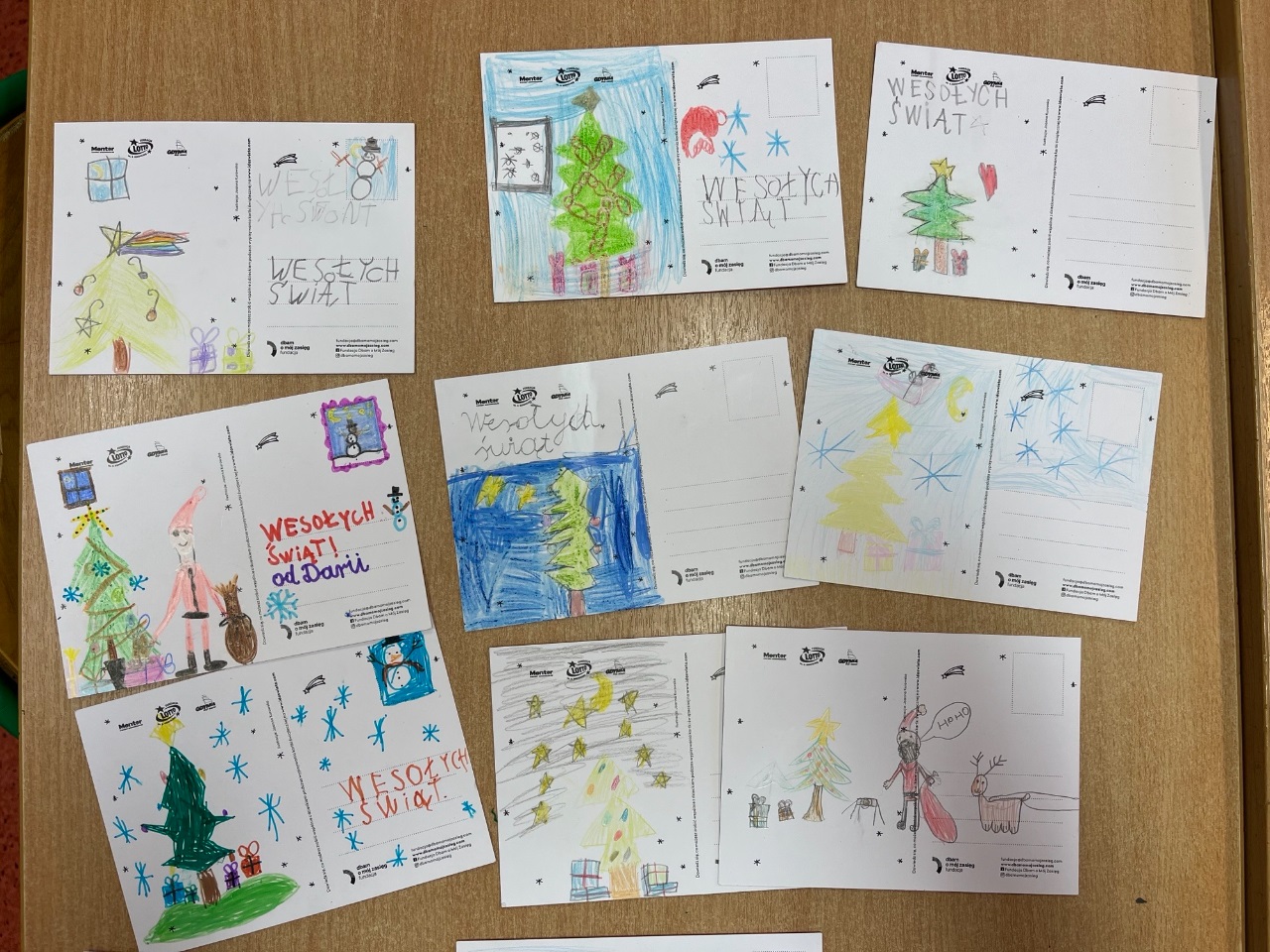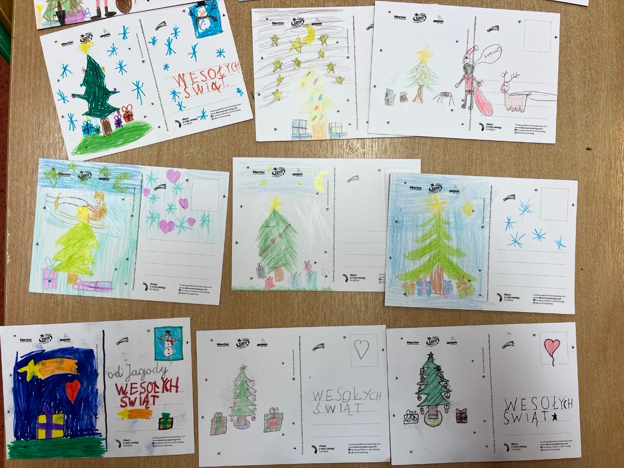 Dzieci z klas 0-3 po raz kolejny wzięły udział w ogólnopolskiej kampanii społecznej “IDĄ ŚWIĘTA, NIE O SMS-IE, LECZ O KARTCE PAMIĘTAJ”, której celem jest zwrócenie uwagi na ważność relacji międzyludzkich w świecie zdominowanym przez nowe technologie. Zakupione w Fundacji Dbam o Mój Z@sięg bożonarodzeniowe kartki, dzieci z radością wypełniły życzeniami i rysunkami, aby wysłać lub przekazać swoim bliskim, osobom samotnym i potrzebującym.
