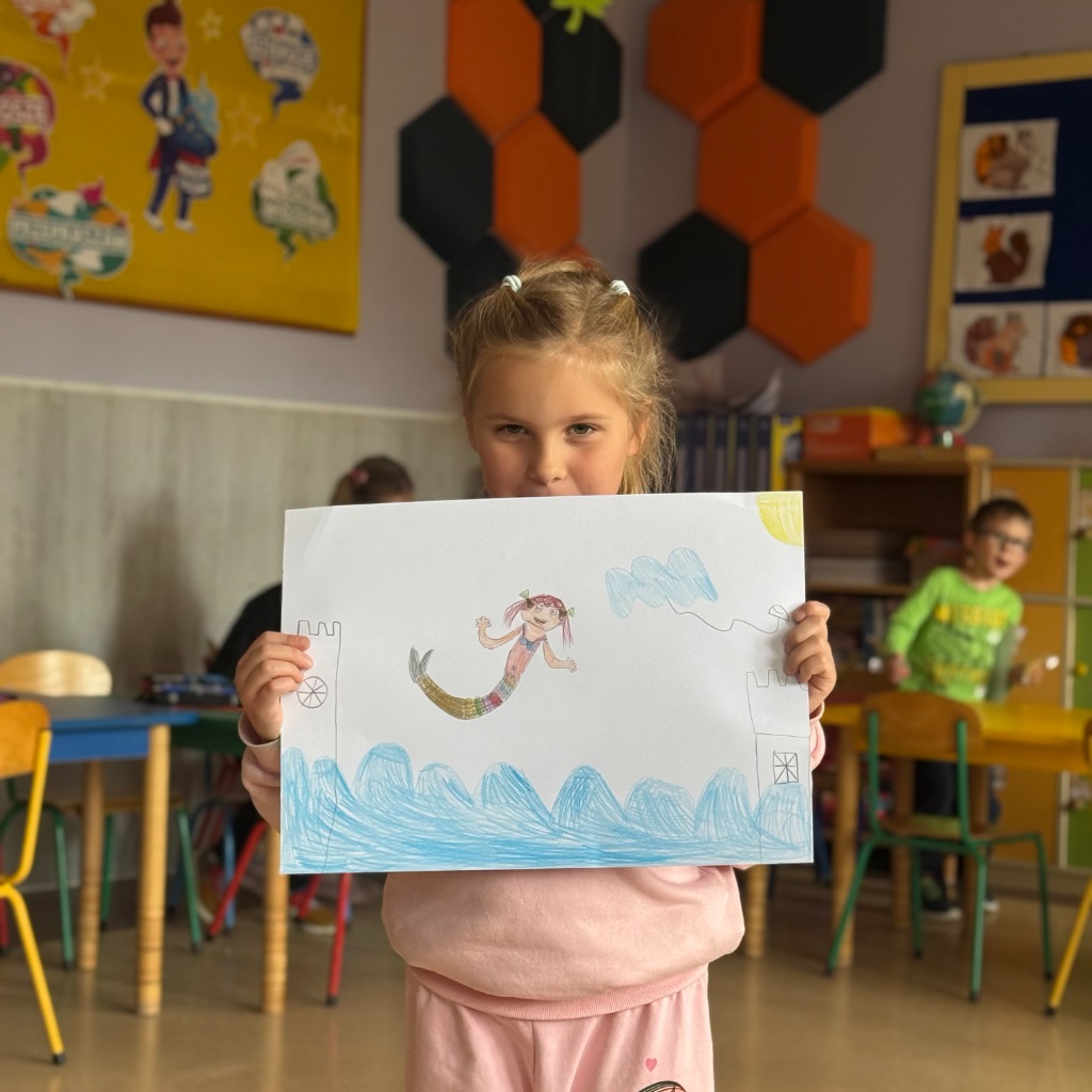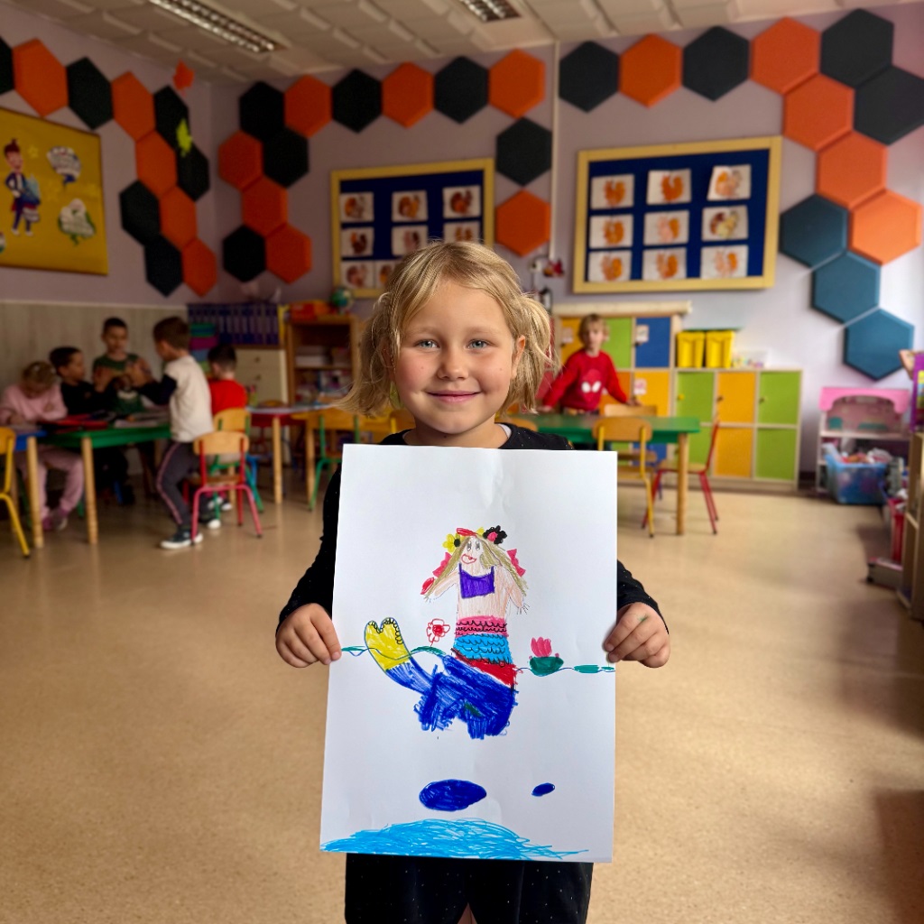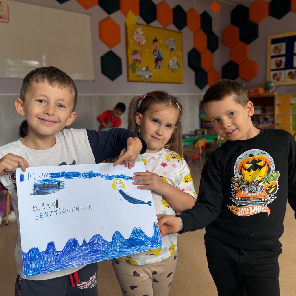 Po omówieniu drugiej legendy o Warszawskiej Syrence dzieci wspólnie wykonały piękne grupowe prace plastyczne, które przypominają im o poznanych legendach. 🎨✨