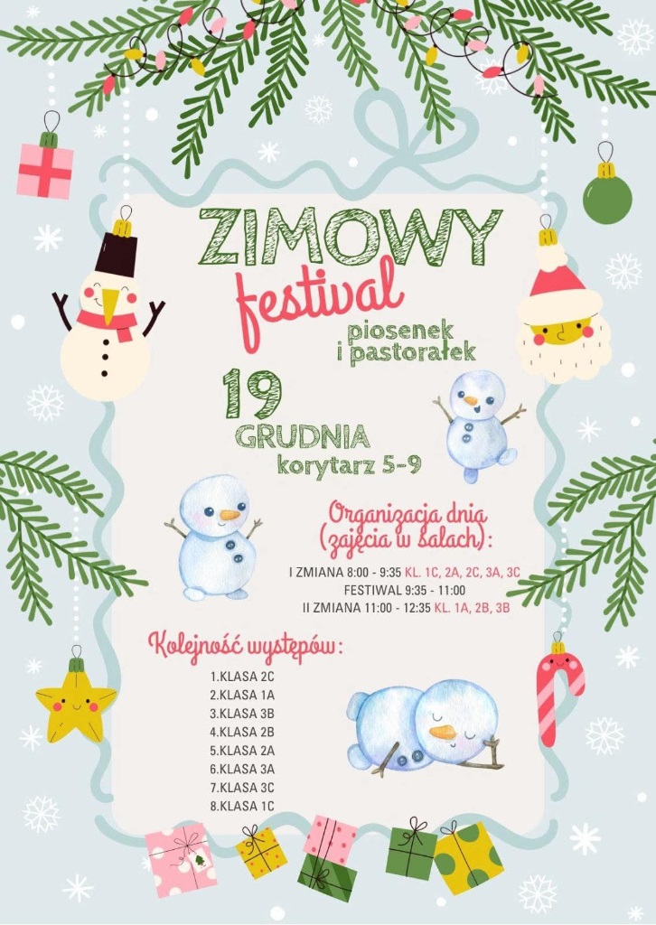 Dzieci z klas 0-3 ostatni szkolny dzień spędziły na wspólnej zabawie podczas Zimowego Festiwalu Piosenek i Pastorałek. Gościliśmy przedszkolaki z Przedszkola nr 62. Film z festiwalu można obejrzeć na naszym szkolnym FB. Klasa 1b, która w tym dniu była w Teatrze Miniatura, nagrała swoją piosenkę. WESOŁYCH ŚWIĄT :)